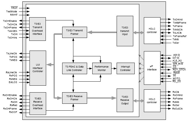 Innovative silicon solutions are a hallmark of Exar's products for the communications markets. Exar offers a full line of multi-channel (1, 2, 3, 4, 6, & 8) framers for DS3/E3 network access applications including network interface units, CSU/DSU equipment, PCM test equipment, fiber optic terminals, and frame relay equipment. These DS3/E3 access control devices meld seamlessly with Exar's industry proven physical-interface components (transceivers and jitter attenuators) offering designers maximum integration and shortened time-to-market. Whatever your design requirement, Exar is the clear choice. Designers have a wide range of Exar framer options that expand their ability to deliver complete system solutions. Devices include the XRT72L50 (single-channel), XRT72L52 (dual-channel), XRT72L53 (triple-channel), XRT72L54 (four-channel), XRT72L56 (six-channel), and the XRT72L58 (eight-channel) products. Each of the devices contain individual HDLC controllers for processing transmit and receive channel payloads. This provides designers with the entire link layer for a frame relay access device in a single-chip and achieve better overall payload management. All devices support full-duplex data flow between the terminal equipment and a transceiver. In addition, they interface with all popular microprocessors. The family will frame data in all standard DS3 and E3 formats: DS3 C-bit parity, DS3 M13, E3 ITU-T G.751 and E3 ITU-T G.832. Also, the devices have a performance monitoring section where a large number of "Reset-upon-Read" and "Read-Only" registers will contain cumulative and "one-second" statistics reflecting the performance and health of the overall IC system.