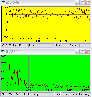 在本次设计中利用CCS提供的断点和探测点,指定FTSK数据文件的输入点,进行相关设定,同时利用CCS提供的图形窗口观察输入和输出的波形与频谱。运行程序,分别得到输入波形和频谱图(图二),输出波形和频谱图(图三)下面分别对这两个图形进行分析。