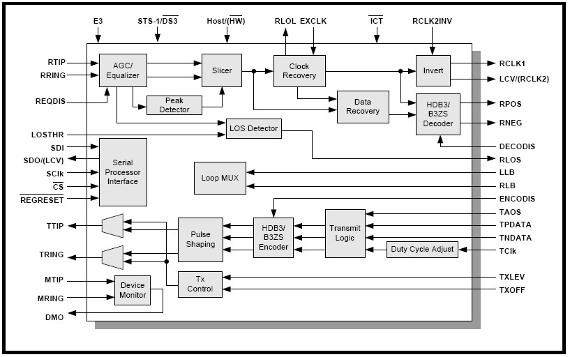 The XRT7300 is a full featured Line Interface Unit (LIU). In the transmit direction, it accepts digital clock and data from the terminal equipment, usually a TDM framer (XRT7250), or an ATM UNI (XRT7234/XRT7245). It optionally encodes the data, and converts it into the appropriate pulse shapes for transmission over coaxial cable. In the receive direction, it accepts a bipolar signal from the line, optionally performs equalization, converts the line signal into a dual rail binary data stream, recovers the clock, optionally decodes the data, and coverts it into a dual rail digital signal.