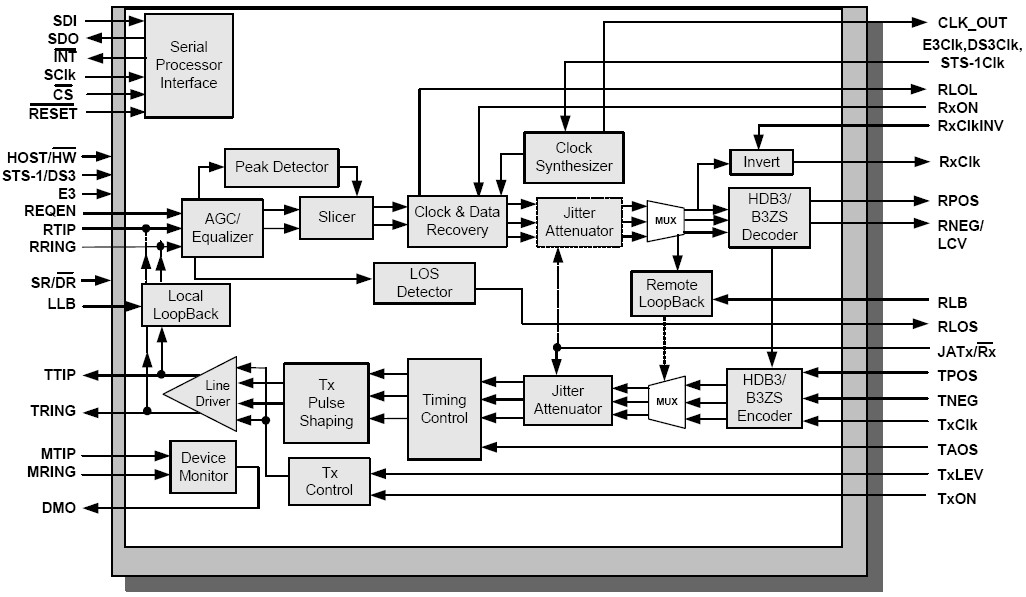 - On chip B3ZS/HDB3 encoder and decoder that can be either enabled or disabled
