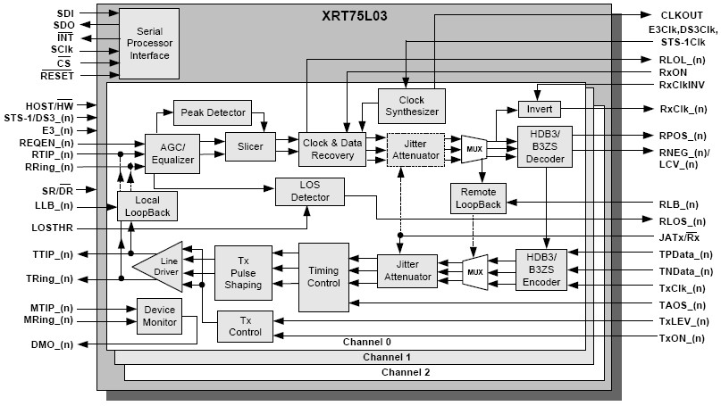 The XRT75L03 is a three-Channel fully integrated Line Interface Unit (LIU) and Jitter Attenuator for E3/DS3/STS-1 applications. It incorporates three independent Receivers, Transmitters and Jitter Attenuators in a single 128-Lead QFP package. Each channel of the XRT75L03 can be independently configured to operate in E3 (34.368 MHz), DS3 (44.736 MHz) or STS-1 (51.84 MHz) rates. Each transmitter can be turned off and tri-stated for redundancy support and power conservation.