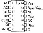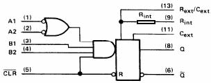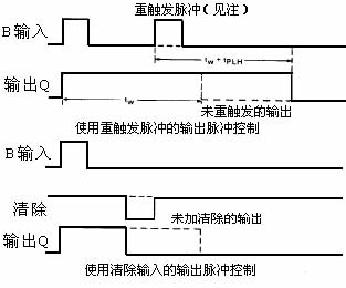 在使用中,外部计时电容可以接到 C ext和Rext/Cext(正向)端之间。若使用内部定时电阻时,应将 Rint接Vcc。为了改善脉冲宽度的准确性和重复性,可在Rext/Cext端和 Vcc端之间接一外部电阻,并将 Rint开路。要获得可变脉冲宽度,可在 R ext/Cext端和 Vcc端之间接一外部电容。