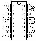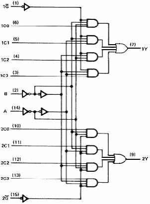 说明: 这种单片数据选择器/复工器的每一部分都有倒相器和驱动器,使与或非门可以对补码、在片的二进制译码数据进行选择。两个四选一单元都有各自的选通