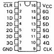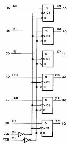 本电路是单向正沿触发的六 D触发器,有公用的时钟和公用的直接清零。在时钟脉冲正跃变的沿上,满足建立时间的 D输入信息可传至 Q输出。时钟的触发产生于特定的电压电平上,同脉冲的正跃变时间无直接关系。不管时钟输入的电平是高或是低,D输入信号不影响输出。电路同其它 TTL和 DTL完全相容。