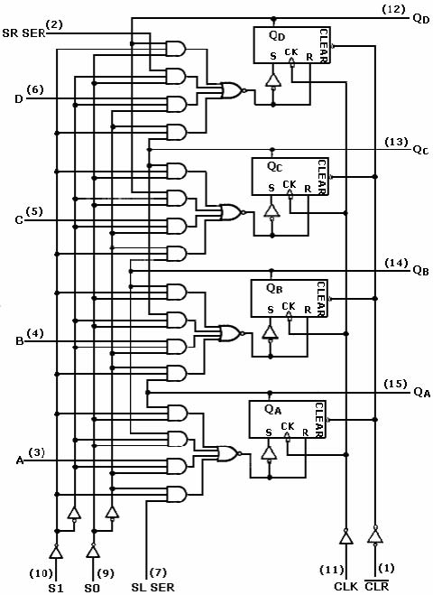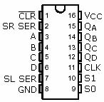 本电路有 46个等效门,有并行输入、并行输出、右移和左移串行输入 ,操作模式控制输入和一个直接无条件清零。设计者实际上组合了系统设计者在一个移位寄存器上所要的全部特点。电路有四个不同的操作方式,为: