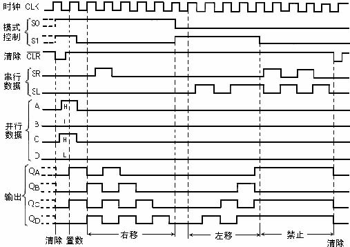 右移是在 S0为高和 S1为低时,用时钟的脉冲上升沿去同步地完成。这种方式的串行数据是在右移数据输入端上进行。当 S0为低和 S1为高时,可同步地左移数据,而数据被送入左移串行输入端。
