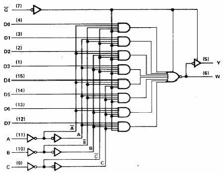 这种单片数据选择器/多路调制器包含有全在片译码功能,可以对 8选 1的数据源进行选择,并有选通控制三态输出。选通