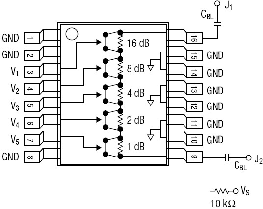 The AA101-80 is a 5-bit, single positive control GaAs IC FET digital attenuator in a low-cost SSOP-16 package. This attenuator has an LSB of 1 dB and a total attenuation of 31 dB. The attenuator requires external DC blocking capacitors, positive supply voltage (VS) and five individual bit control voltages (V1–V5). The AA101-80 is particularly suited where high attenuation accuracy, low insertion loss and low intermodulation products are required. Typical applications include base station, wireless data, and wireless local loop gain level control circuits.