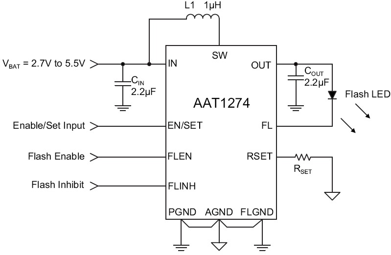 The AAT1274 is a high-efficiency, high-current boost converter capable of 1.5A typical output current. It is an ideal power solution for LED photo flash applications in all single cell Li-ion powered products. The AAT1274 maintains output current regulation by switching the internal high-side and low-side switch transistors. The transistor switches are pulse-width modulated at a fixed frequency of 2MHz. The high switching frequency allows the use of a small inductor and output capacitor, making the AAT1274 ideally suited for small battery-powered applications. Skyworks' proprietary AS2Cwire™ (Advanced Simple Serial Control™) serial digital interface is used to enable, disable, configure, and program the operation of the AAT1274. Using the AS2Cwire interface, the movie-mode current level for each LED, the safety timer delay, and the flash-to-movie-mode current ratio can be programmed to one of 16 levels. In addition, the single-wire serial protocol sets output channel control. The AAT1274 also includes a separate Flash Enable input to initiate both the flash operation and the default timer which can be used either to terminate a flash event at the end of a userprogrammed delay or as a safety feature. Also included is a Flash Inhibit pin which reduces the flash current to movie-mode levels during high battery demand. The maximum flash and movie-mode current is set by one external resistor where the ratio of Flash to Moviemode current is set at approximately 7.3:1. One or two LEDs can be connected to the AAT1274, where in the case of two LEDs the output current is matched between each diode. The AAT1274 contains a thermal management system to protect the device in the event of an output short-circuit condition. Built-in circuitry prevents excessive inrush current during start-up. The shutdown feature reduces quiescent current to less than 1.0μA. The AAT1274 is available in a Pb-free, thermally-enhanced 14-pin 3x3mm TDFN package.