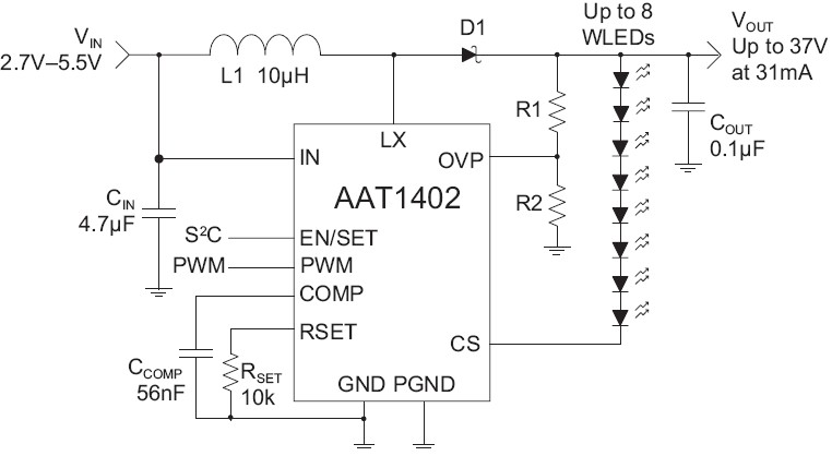 The AAT1402 is a step-up single channel LED driver with an input voltage range of 2.7V to 5.5V. The wide input voltage range, small solution size, advanced dimming features and high efficiency is suitable for LED backlight solutions for single cell Li-ion based equipment. A precision, high voltage current sink maintains the maximum LED current set by an external resistor from 10 to 31mA. The high switching frequency supports ultra small, low cost filtering components. Two dimming controls are available; 32 dimming steps using the S2Cwire™ interface, and filtered PWM control. The frequency range of the PWM dimming extends up to 100 kHz eliminating audible noise and suitable for CABC (Content Adaptive Brightness Control) applications. The device includes over-temperature protection and programmable over-voltage protection and recovers automatically when the faults are removed. The AAT1402 is available in a 10-pin wafer-level chip scale package (WLCSP) and is rated over the -40°C to +85°C temperature range.