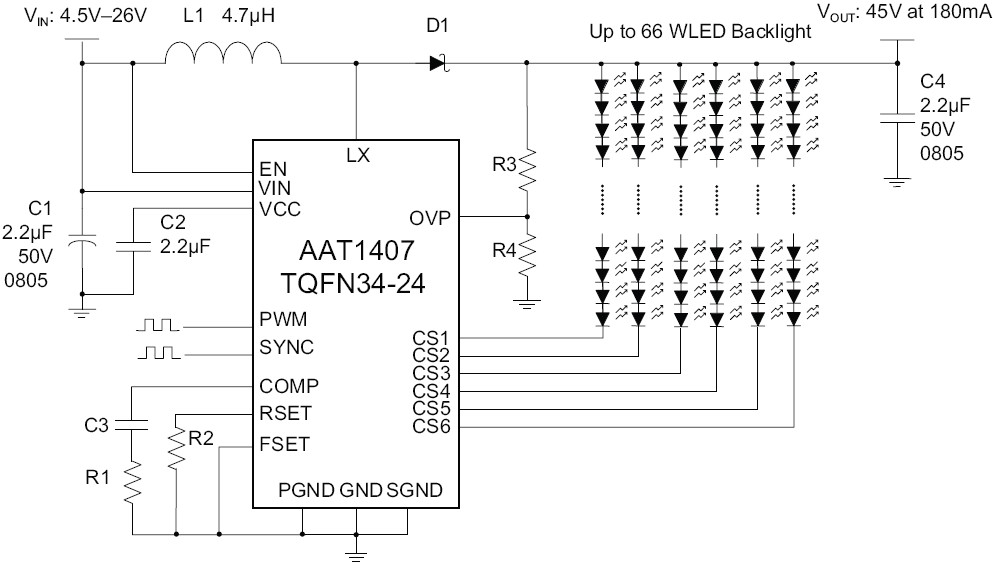 AAT1407 Six-Channel LED Backlight Driver with Integrated Boost and High Frequency Direct PWM Dimming