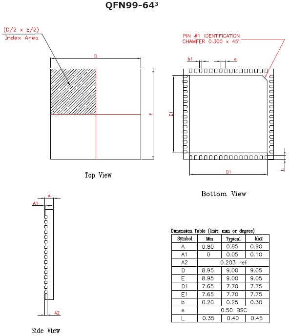 - 9mm x 9mm 64-pin QFN Package with 0.5mm pitch or 14mm x 14mm 64-pin Low Profile QFP Package with 0.8mm pitch