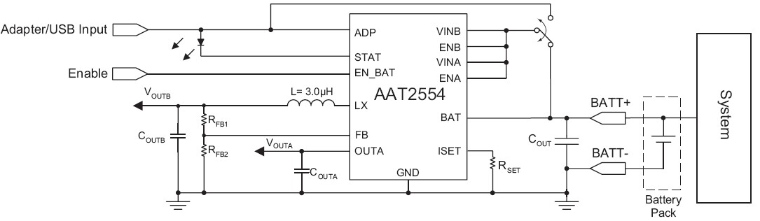 The AAT2554 is a fully integrated 500mA battery charger, a 300mA step-down converter, and a 300mA low dropout (LDO) linear regulator. The input voltage range is 4V to 7.5V for the battery charger and 2.7V to 5.5V for the step-down converter and linear regulator, making it ideal for applications operating with single-cell lithium-ion/polymer batteries. The battery charger is a complete constant current/constant voltage linear charger. It offers an integrated pass device, reverse blocking protection, high accuracy current and voltage regulation, charge status, and charge termination. The charging current is programmable via external resistor from 30mA to 500mA. In addition to these standard features, the device offers over-voltage, current limit, and thermal protection. The step-down converter is a highly integrated converter operating at a 1.5MHz switching frequency, minimizing the size of external components while keeping switching losses low. The output voltage ranges from 0.6V to the input voltage. The AAT2554 linear regulator is designed for high speed turn-on and turn-off performance, fast transient response, and good power supply ripple rejection. Delivering up to 300mA of load current, it includes short-circuit protection and thermal shutdown. The AAT2554 is available in a Pb-free, thermally-enhanced TDFN34-16 package and is rated over the -40°C to +85°C temperature range.