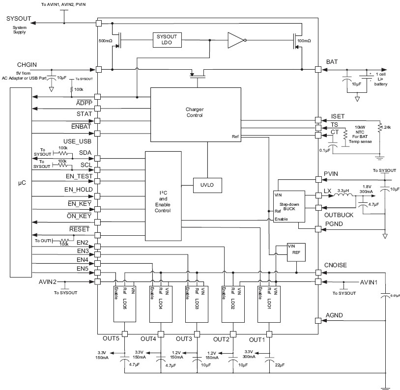 - Noise: 50μVrms for LDO3, LDO4, and LDO5