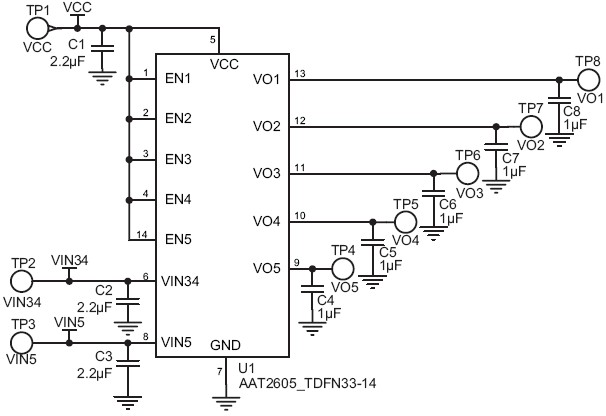 Management IC (TPMIC™) product family. It contains five fully integrated 300mA low dropout (LDO) regulators in a small Pb-free 14-pin 3mm x 3mm TDFN package, making it ideal for space-constrained systems. The AAT2605 features low power consumption, low dropout, and high noise immunity from the input power supply. Each channel consumes a mere 30μA of current when enabled, features 250mV of dropout at 250mA and 68dB of power supply rejection at 10kHz. Each channel has its own enable pin and uses a small 1μF output capacitor. Output voltages are factory One Time Programmable (OTP) between 0.6V and 3.7V with 100mV increment and typical regulation accuracy is ±1%. LDO1 and LDO2 share the same input voltage, as do LDO3 and LDO4 while LDO5 has its own independent input. The AAT2605 is a safe solution that integrates an over-current limit for each channel and an over-thermal protection. The device is rated over a temperature range of -40°C to 85°C.
