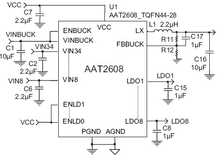 The AAT2608 is a member of Skyworks' Total Power Management IC (TPMIC™) product family. It contains an 800mA switching regulator and eight fully integrated 300mA low dropout (LDO) regulators in a small, Pb-free 28-pin 4mmx4mm TQFN package, making it ideal for space-constrained systems. The step-down converter is a monolithic synchronous converter with an integrated compensation network and 90% efficiency. It operates at 1.5MHz and uses a tiny 2.2μH inductor with a small 10μF output capacitor. At no load the switching converter quiescent current is 70μA. The 8 channel 300mA LDO regulator features low power consumption, low dropout, and high noise immunity from the input power supply. Each channel consumes a mere 30μA of current when enabled, features 250mV of dropout at 250mA, and 68dB of power supply rejection at 10kHz. Each channel uses a small 1μF output capacitor and 2.2μF input capacitor. All regulators include a separate enable, providing a convenient solution to implement any power-up and power-down sequencing. All output voltages are factory One Time Programmable (OTP) between 0.6V and 3.7V with 100mV increment and typical regulation accuracy is ±1%. The switcher has a separate input from the linear regulators, permitting post-regulation configuration of the LDO channels from the switcher’s output. Its output is externally programmable with external resistors. LDO1 and LDO2 share the same input voltage, as do LDO3 and LDO4, while LDO5 through LDO8 have their own independent input. The AAT2608 is a safe solution which integrates an over-current limit for each channel and over-thermal protection. The device is rated over a temperature range of -40°C to 85°C.