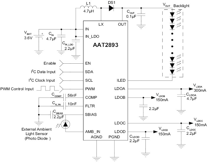 AAT2893 CABC Compatible, Ambient Light Control Boost LED Backlight Driver and Four LDOs