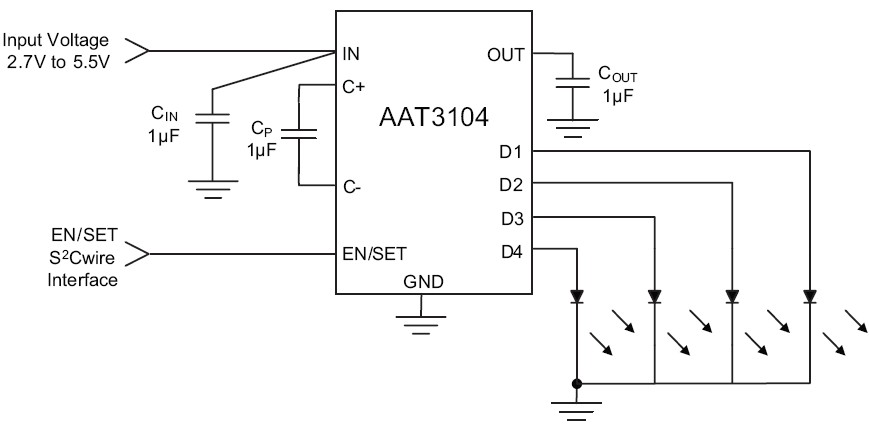 The AAT3104 is a step-up single channel LED driver with an input voltage range of 2.7V to 5.5V. The wide input voltage range, small solution size, advanced dimming features and high efficiency is suitable for LED backlight solutions for single cell Li-ion based equipment. A precision, high voltage current sink maintains the maximum LED current set by an external resistor from 10 to 31mA. The high switching frequency supports ultra small, low cost filtering components. Two dimming controls are available; 32 dimming steps using the S2Cwire™ interface, and filtered PWM control. The frequency range of the PWM dimming extends up to 100 kHz eliminating audible noise and suitable for CABC (Content Adaptive Brightness Control) applications. The device includes over-temperature protection and programmable over-voltage protection and recovers automatically when the faults are removed. The AAT3104 is available in a 10-pin wafer-level chip scale package (WLCSP) and is rated over the -40°C to +85°C temperature range.
