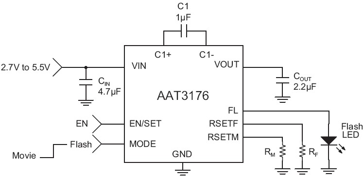 The AAT3176 is a high output current, high efficiency, low noise, low profile charge pump converter IC, ideal for multi-function LED photo-flash applications where solution cost, size, and efficiency are critical. The charge pump is capable of delivering up to 500mA of output current and can be easily programmed in 16 steps with a single GPIO output through SKYWORKS' S2Cwire™ (Simple Serial Control) interface. This allows smooth transitions and flexible adjustment of brightness in flash or other lighting modes. Operating at a fast 1MHz switching frequency, the dual-mode (1x/2x) operation of the internal charge pump offers excellent power efficiency for both flash and movie modes and combined with a low external parts count (one 1μF flying capacitors and small bypass capacitors at VIN and OUT), the AAT3176 is ideally suited for small, battery-powered applications. The maximum current for both Flash and Movie mode is set by two independent external resistors. The MODE pin is adopted to select the LED current between Movie (Torch) and Flash mode. The AAT3176 has a thermal management system to protect the device in the event of short-circuit, open-circuit, and over-temperature condition. Built-in soft-start circuitry prevents excessive in-rush current during startup. The shutdown feature disconnects the load from VIN and reduces quiescent current to less than 1.0μA. The AAT3176 is available in the 2.2 x 2.2mm Pb-free 10-pin TDFN package.