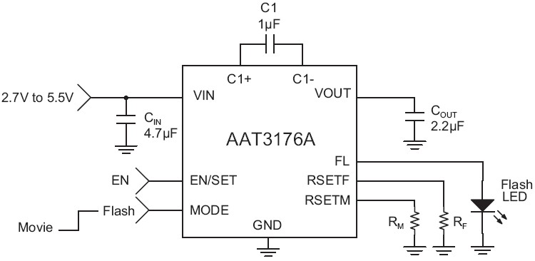 The AAT3176A is a high output current, high efficiency, low noise, low profile charge pump converter IC, ideal for multi-function LED photo-flash applications where solution cost, size, and efficiency are critical. The charge pump is capable of delivering up to 500mA of output current and can be easily programmed in 16 steps with a single GPIO output through SKYWORKS' S2Cwire™ (Simple Serial Control) interface. This allows smooth transitions and flexible adjustment of brightness in flash or other lighting modes. Operating at a fast 1MHz switching frequency, the dual-mode (1x/2x) operation of the internal charge pump offers excellent power efficiency for both flash and movie modes and combined with a low external parts count (one 1μF flying capacitors and small bypass capacitors at VIN and OUT), the AAT3176A is ideally suited for small, battery-powered applications. The maximum current for both Flash and Movie mode is set by two independent external resistors. The MODE pin is adopted to select the LED current between Movie (Torch) and Flash mode. The AAT3176A has a thermal management system to protect the device in the event of short-circuit, open-circuit, and over-temperature condition. Built-in soft-start circuitry prevents excessive in-rush current during startup. The shutdown feature disconnects the load from VIN and reduces quiescent current to less than 1.0μA. The AAT3176A is available in the 2.2 x 2.2mm Pb-free 10-pin TDFN package.