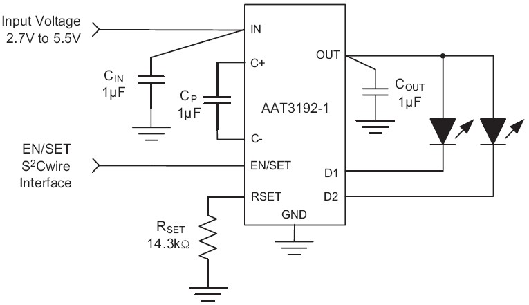 The AAT3192 is a charge-pump based, current-sink white LED driver capable of driving one or two LEDs up to 30mA, each. It automatically switches between 1x mode and 2x mode to maintain the highest efficiency and optimal LED current accuracy and matching. The AAT3192 charge pump’s 1x mode (bypass mode) has very low resistance allowing LED current regulation to be maintained with input supply voltage approaching the LED forward voltage. The AAT3192 is available in the 2×2.2mm, 10-lead SC70JW-10 package.