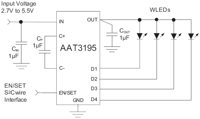 The AAT3195 is a charge-pump based, current-sink white LED driver capable of driving one to four LEDs up to 30mA, each. It automatically switches between 1x mode and 2x mode to maintain the highest efficiency and optimal LED current accuracy and matching. The AAT3195 charge pump’s 1x mode (bypass mode) has very low resistance allowing LED current regulation to be maintained with input supply voltage approaching the LED forward voltage. The AAT3195 incorporates an internal RSET and is available in a thermally enhanced, Pb-free 2x2.2mm 10-lead SC70JW-10 package.