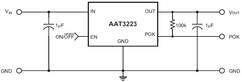 The AAT3223 PowerLinear NanoPower low dropout (LDO) linear regulator is ideal for portable applications where extended battery life is critical. This device features extremely low quiescent current, typically 1.1μA. Dropout voltage is also very low, typically 190mV at 100mA. The AAT3223 has an enable pin which, when pulled low, will put the LDO regulator into shutdown mode, removing power from its load and offering extended power conservation capabilities for portable battery-powered applications. The AAT3223 also has a Power-OK (POK) feature which monitors the LDO output voltage and will alert the system if the output falls out of regulation. The AAT3223 has output short-circuit and over-current protection. In addition, the device has an over-temperature protection circuit, which will shut down the LDO regulator during extended over-current events. The AAT3223 is available in a Pb-free, space-saving 6-pin SOT23 package and is rated over the -40°C to +85°C temperature range. The AAT3223 is similar to the AAT3221 with the exception that it offers the additional Power-OK function through the POK pin.