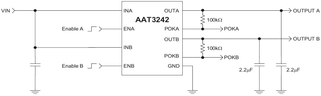 The AAT3242 is a dual low dropout linear regulator with Power OK (POK) outputs. Two integrated regulators provide a high power 300mA output and a lower power 150mA output, making this device ideal for use with microprocessors and DSP cores in portable products. Two POK pins provide open drain output signals when their respective regulator output is within regulation. The AAT3242 has independent input voltage and enable pins for increased design flexibility. This device features a very low quiescent current (140μA typical) and low dropout voltages (typically 200mV and 400mV at the full output current level), making it ideal for portable applications where extended battery life is critical. The AAT3242 has complete over-current/short-circuit and over-temperature protection circuits to guard against extreme operating conditions. The AAT3242 is available in the space-saving, Pb-free, 12-pin TSOPJW and TDFN33 packages. This device is capable of operation over the -40°C to +85°C temperature range.