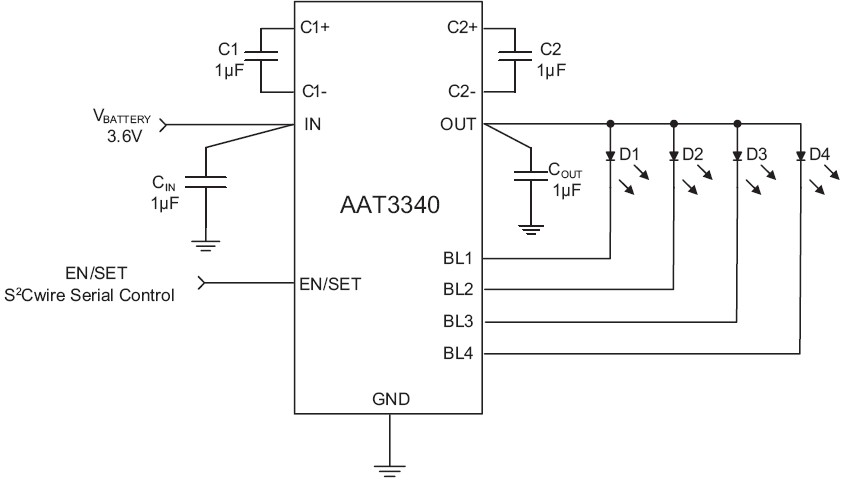 The AAT3340 is a low-noise, constant-frequency charge pump DC/DC converter that uses a dual-mode load switch (1x) and fractional (1.5x) conversion to maximize efficiency for white LED applications. The AAT3340 is capable of driving 4 white LEDs at a total of 80mA from a single 2.7V to 5.5V input. The current sinks may be operated individually or in parallel while driving higher-current LEDs. A low external parts count (two 1μF flying capacitors and two small 1μF capacitors at VIN and VOUT) makes the AAT3340 ideal for small battery-powered applications. Skyworks' Simple Serial Control (S2Cwire) digital interface is used to enable, disable and set current to one of 32 levels for the LEDs. The AAT3340 is equipped with built-in short-circuit and over-temperature protection. The soft-start circuitry prevents excessive inrush current at start-up and mode transitions. The AAT3340 family is available in Pb-free, space-saving TSOPJW and TDFN33 packages, and operates over the -40°C to +85°C ambient temperature range.