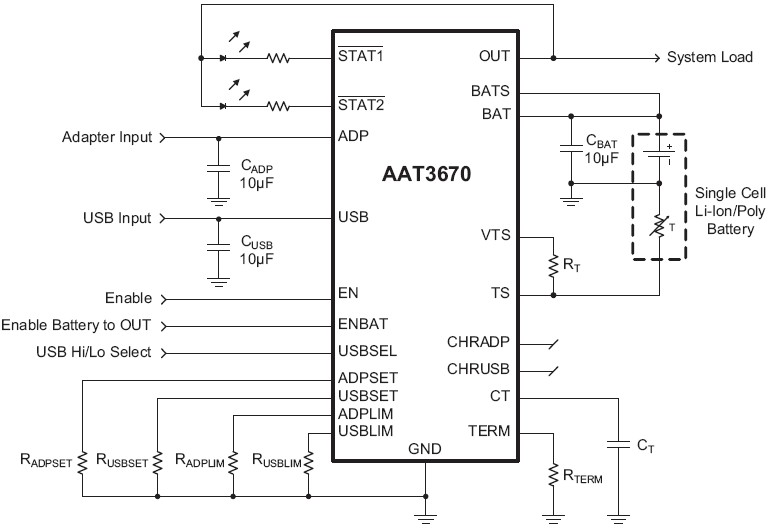 The AAT3670 BatteryManager is a highly integrated single- cell lithium-ion/polymer (Li-ion) battery charger and system power management IC that enables simultaneous battery charging and full system usage without compromising the battery’s charge cycle life. It operates with low-voltage AC adapter (ADP) and USB inputs and requires a minimum number of external components. The AAT3670 selects ADP or USB to power the system load and charge the battery when ADP/USB power is available. The AAT3670 precisely regulates battery charge voltage and current for 4.2V Li-ion cells. Charge current can be programmed up to 1.6A for ADP charging and 0.9A or 0.1A for USB charging by resistors on the ADPSET / USBSET pins. The charge termination current threshold is set by an external resistor on the TERM pin. The AAT3670 has a voltage-sensed charge current reduction loop that enables system operation without a power shortage. When the input voltage falls below the programmable charge reduction threshold, the device automatically reduces the charge current until the input voltage returns to the threshold voltage. Battery temperature and charge state are fully monitored for fault conditions. In the event of a battery over-voltage/ short-circuit/over-temperature condition, the charger will automatically shut down, protecting the charging device, control system, and battery. Two status monitor output pins (STAT1 and STAT2) are provided to indicate battery charge status by directly driving external LEDs. The AAT3670 is available in a Pb-free, thermallyenhanced, space-saving 24-pin 4 × 4mm QFN package.