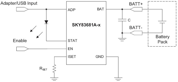 The AAT3681A BatteryManager is an integrated single cell lithium-ion/polymer battery charger IC, designed to operate from a DC power source or USB port up to an input voltage of 7.5V. It requires just one external component. The AAT3681A precisely regulates battery charge voltage and current for 4.2V (4.375V option) lithium-ion/ polymer battery cells. When charged from an AC adapter or USB port, the battery charging current can be set by an external resistor up to 500mA. Battery charge state is continuously monitored for fault conditions. In the event of an over-voltage, short-circuit, or over-temperature failure, the device will automatically shut down, thus protecting the charging device, control system, and the battery under charge. A status monitor output pin is provided to indicate the battery charge status by directly driving an external LED. The AAT3681A is available in a Pb-free, thermally enhanced, space-saving 8-pin 2.0 × 2.1mm SC70JW package and is specified for operation over the -40°C to +85°C temperature range.