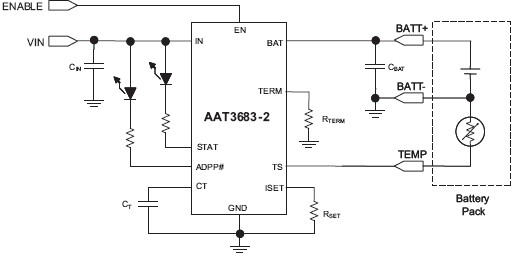 The AAT3683 BatteryManager is a highly integrated single- cell lithium-ion / polymer (Li-Ion) battery charger that operates from a USB port or an AC adapter input up to an input voltage of 7.5V. The AAT3683 precisely regulates battery charge voltage and current for 4.2V Li-Ion battery cells. The battery charging current can be set by an external resistor up to 1A. Digital Thermal Loop Control maintains the maximum possible battery charging current for the given set of input to output power dissipation and ambient temperature conditions. Battery charge state is continuously monitored for fault conditions. In the event of an over-current, over-voltage, short-circuit, or over-temperature condition, the device will shut down automatically, thus protecting the charging device, control system, and the battery under charge. A status monitor output pin is provided to indicate the battery charge status by directly driving an external LED. An open-drain power source detection output is provided to report the power supply status. The AAT3683 is available in the Pb-free, thermallyenhanced, space-saving 2.2 x 2.2mm 10-pin STDFN (AAT3683-2) and 16-pin QFN33 (AAT3683-4) packages and is specified for operation over the -40°C to +85°C temperature range.