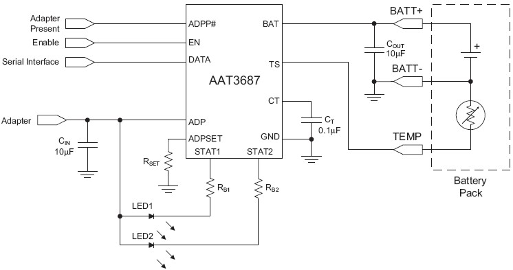 The AAT3687 BatteryManager is a highly integrated single- cell lithium-ion/polymer battery charger IC designed to operate with AC adapter inputs. It requires a minimum number of external components. The AAT3687 precisely regulates battery charge voltage and current for 4.2V lithium-ion/polymer battery cells. Adapter charge current rates can be programmed up to 1.5A. An active thermal management system regulates the fast charge constant current for all ambient temperature and input vs. output voltage conditions. Battery temperature and charge state are fully monitored for fault conditions. In the event of an over-voltage or over-temperature failure, the device will automatically shut down, thus protecting the charging device, control system, and the battery under charge. Status monitor output pins are provided to indicate the battery charge status by directly driving two external LEDs. A serial interface output is available to report 12 various charging status states to a microcontroller. The AAT3687 is available in a Pb-free, thermally-enhanced, space-saving 12-pin TDFN 3x3mm package and is rated over the -40°C to +85°C temperature range.