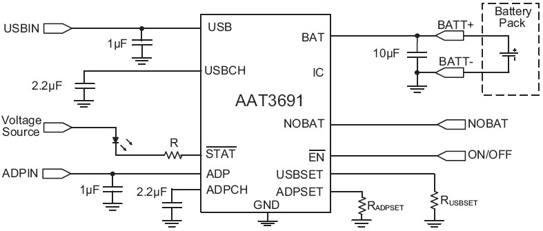 The AAT3691 BatteryManager™ is an integrated single cell Lithium-Ion (Li-Ion) battery charger IC, designed to operate from USB ports, AC adapter inputs, or from a cellular phone charger adapter up to an input voltage of typical 6.75V. For increased safety, The AAT3691 also includes over-voltage input protection (OVP) up to 28V. The AAT3691 precisely regulates battery charge voltage and current for 4.2V Li-Ion battery cells. The charge current can be programmed up to 1.6A for ADP charging and 0.5A for USB charging by external resistors on the ADPSET/USBSET pins. In the case of an over-voltage condition of ADP or USB input power exceeding typical 6.75V, the internal series switch opens, blocking the damage to the battery and charging circuitry. The AAT3691 also includes a no-battery present input (NOBAT). When the NOBAT indicates that no battery is present, OVP block will prevent the input power from passing through the OVP block and suspend the charging function. Battery charging status is continuously monitored for fault conditions. In the event of a battery over voltage or chip over thermal failure, the charger will automatically shutdown, protecting the charging device, control system and battery, until the fault condition is removed. The open drain status monitor output pin (STAT) is adopted to report battery charging activity by active low. The AAT3691 comes in a thermally enhanced, spacesaving, Pb-free 16-pin 3x4 mm TDFN package and is specified for operation over the -40°C to +85°C temperature range.