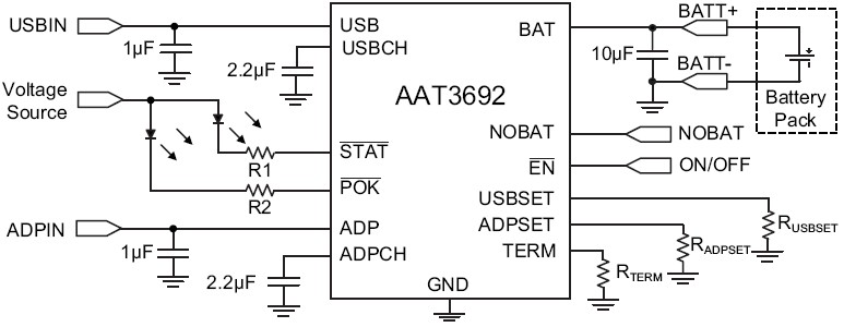The AAT3692 BatteryManager™ is an integrated single cell Lithium-Ion (Li-Ion) battery charger IC, designed to operate from USB ports, AC adapter inputs, or from a cellular phone charger adapter up to an input voltage of 7.2V typical. For increased safety, the AAT3692 also includes over-voltage input protection (OVP) up to 28V. The AAT3692 precisely regulates battery charge voltage and current for 4.2V Li-Ion battery cells. The charge current can be programmed up to 1.6A for ADP charging and 0.5A for USB charging by external resistors on the ADPSET/USBSET pins; the percentage of the termination charging current is programmable by an external resistor on the RTERM pin. In the case of an over-voltage condition of ADP or USB input power exceeding typical 7.2V, the internal series switch opens, blocking the damage to the battery and charging circuitry. The AAT3692 also includes a no-battery present input (NOBAT). When NOBAT indicates that no battery is present, the charging function will be suspended while OVP is still active. Battery charging status is continuously monitored for fault conditions. In the event of a battery over-voltage or chip over thermal failure, the charger will automatically suspend charging, protecting the charging device, control system and battery, until the fault condition is removed. An open drain POK pin indicates the valid input of AC adapter or USB power; an open drain status monitor output pin (STAT) is adopted to report battery charging activity by active low. The AAT3692 comes in a thermally enhanced, spacesaving, Pb-free 16-pin 3x4 mm TDFN package and is specified for operation over the -40°C to +85°C temperature range.