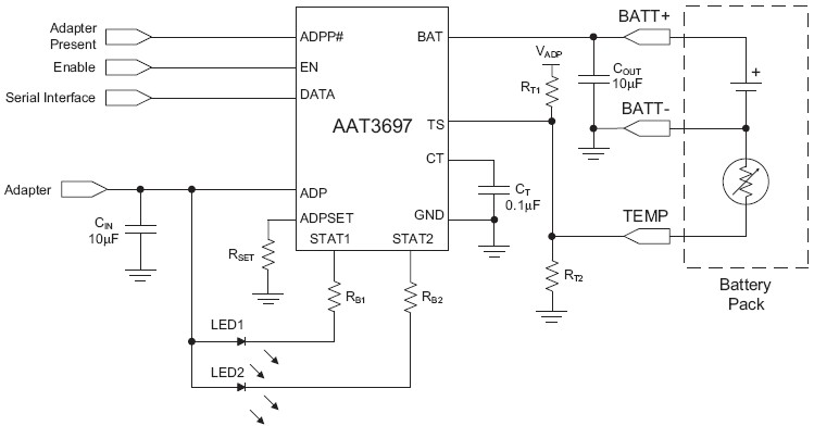 The AAT3697 BatteryManager is a highly integrated single- cell lithium-ion/polymer battery charger IC designed to operate with AC adapter inputs. It requires a minimum number of external components. The AAT3697 precisely regulates battery charge voltage and current for 4.2V lithium-ion/polymer battery cells. Adapter charge current rates can be programmed up to 2.0A. An active thermal management system regulates the fast charge constant current for all ambient temperature and input vs. output voltage conditions. Battery temperature and charge state are fully monitored for fault conditions. In the event of an over-voltage or over-temperature failure, the device will automatically shut down, thus protecting the charging device, control system, and the battery under charge. Status monitor output pins are provided to indicate the battery charge status by directly driving two external LEDs. A serial interface output is available to report 12 various charging status states to a microcontroller. The AAT3697 is available in a Pb-free, thermally-enhanced, space-saving 12-pin TDFN 3x3mm package and is rated over the -40°C to +85°C temperature range.