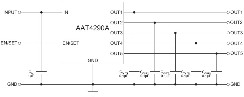 The AAT4290A and AAT4291A SmartSwitch products are members of Skyworks' Application Specific Power MOSFET (ASPM™) product family. The AAT4290A and AAT4291A are five and three P-channel MOSFETs, respectively, configured for use as a microprocessor I/O expander. Having independent drain outputs and a common source input, they operate with an input voltage ranging from 1.8V to 5.5V, making them ideal for 2.5V, 3.3V, or 5V systems, as well as systems powered by lithium-ion/polymer batteries. Each switch features a 500ns turn-on time. The switch states are controlled by a Simple Serial Control (S2Cwire™) interface which permits ease of control and efficiency of size. The quiescent supply current is very low, typically 4.5μA. In shutdown mode, the supply current is reduced to less than 1μA. The AAT4290A and AAT4291A are offered in a Pb-free, 8-pin SC70JW package specified over the -40°C to +85°C temperature range.