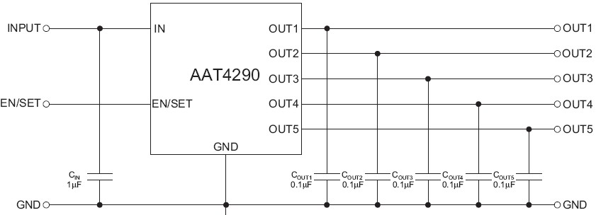 The AAT4290 and AAT4291 SmartSwitch products are members of Skyworks' Application Specific Power MOSFET (ASPM™) product family. The AAT4290 and AAT4291 are five and three P-channel MOSFETs, respectively, configured for use as a microprocessor I/O expander. Having independent drain outputs and a common source input, they operate with an input voltage ranging from 1.8V to 5.5V, making them ideal for 2.5V, 3.3V, or 5V systems, as well as systems powered by lithium-ion/polymer batteries. Each switch features a 500ns turn-on time. The switch states are controlled by Skyworks' Simple Serial Control (S2Cwire™) interface which permits ease of control and efficiency of size. The quiescent supply current is very low, typically 4.5μA. In shutdown mode, the supply current is reduced to less than 1μA. The AAT4290 and AAT4291 are offered in a Pb-free, 8-pin SC70JW package specified over the -40°C to +85°C temperature range.