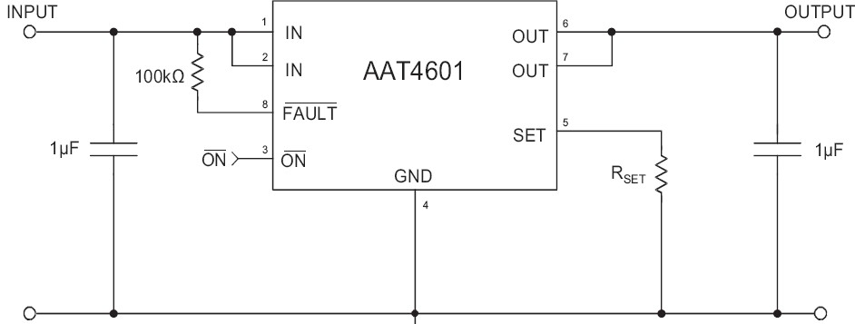 The AAT4601 SmartSwitch is a member of Skyworks' Application Specific Power MOSFET™ (ASPM™) product family. It is a 1.8A current limited P-channel MOSFET power switch designed for high-side load switching applications. This switch operates with inputs ranging from 2.7V to 5.5V, making it ideal for both 3V and 5V systems. An integrated current-limiting circuit protects the input supply against large changes in load current which could cause the supply to fall out of regulation. The AAT4601 has protection from thermal overload which limits power dissipation and junction temperatures. The maximum current limit level will guarantee that 1.8A can be delivered to the load; the actual threshold is programmed with a resistor from the SET pin to ground. The quiescent supply current is typically 12μA. In shutdown mode, the supply current decreases to less than 1μA. The AAT4601 is available in a Pb-free, 8-pin SOP package and is specified over the -40°C to +85°C temperature range.