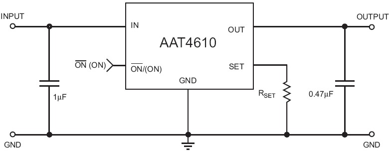 The AAT4610 SmartSwitch is a current limited P-channel MOSFET power switch designed for high-side load switching applications. This switch operates with inputs ranging from 2.7V to 5.5V, making it ideal for both 3V and 5V systems. An integrated current-limiting circuit protects the input supply against large currents which may cause the supply to fall out of regulation. The AAT4610 is also protected from thermal overload which limits power dissipation and junction temperatures. It can be used to control loads that require up to 1A. Current limit threshold is programmed with a resistor from SET to ground. The quiescent supply current is typically a low 15μA max. In shutdown mode, the supply current decreases to less than 1μA. The AAT4610 is available in a Pb-free 5-pin SOT23 package and is specified over the -40°C to +85°C temperature range.