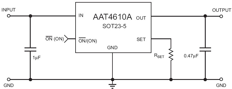 The AAT4610A SmartSwitch is a current limited P-channel MOSFET power switch designed for high-side load switching applications. This switch operates with inputs ranging from 2.7V to 5.5V, making it ideal for both 3V and 5V systems. An integrated current-limiting circuit protects the input supply against large currents which may cause the supply to fall out of regulation. The AAT4610A is also protected from thermal overload which limits power dissipation and junction temperatures. It can be used to control loads that require up to 1A. Current limit threshold is programmed with a resistor from SET to ground. The quiescent supply current is typically a low 15μA max. In shutdown mode, the supply current decreases to less than 1μA. The AAT4610A is available in a Pb-free 5-pin SOT23 package and is specified over the -40°C to +85°C temperature range.