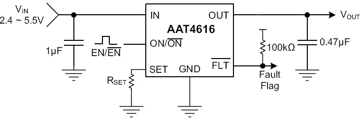 The AAT4616 SmartSwitch is a current limited P-channel MOSFET power switch designed for high side load switching applications. This switch operates with inputs ranging from 2.4V to 5.5V, making it ideal for both 3V and 5V systems. An integrated, highly accuarate current-limiting circuit protects the input supply against large currents which may cause the supply to fall out of regulation. Reverse current blocking is provided to protect the load switch from reverse current flows while the device is in shutdown. The AAT4616 is also protected from thermal overload which limits power dissipation and junction temperature. Current limit threshold is programmed with a resistor from SET to ground and may be adjusted for load levels up to 1.6A. The ultra-fast current limit response to a sudden short circuit is a mere 2μs which reduces the requirements of local supply bypassing. An open drain FAULT flag signals an over-current or over-temperature condition. To prevent false reporting, a 4ms time interval is used at startup (charging a capacitive load), where fault conditions are not monitored and reported. Quiescent current is a low 10μA and the supply current decreases to less than 1μA in shutdown mode. The AAT4616 is offered in the small Pb-free, 5-pin SOT23-5 and TDFN22-8 packages, and is specified for operation over the -40°C to +85°C ambient temperature range.