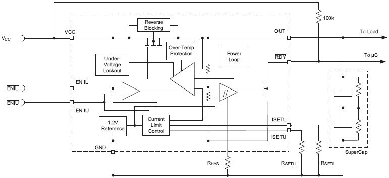 The AAT4621 SmartSwitch family is a current limited P-channel MOSFET power switch designed for high-side load-switching applications in PC Card GSM/GPRS/3G modem cards. Used in conjunction with a super capacitor, the AAT4621 will ensure that the power ratings of the PCMCIA host are not exceeded at any time. Featuring two independent, programmable current limits and a power loop, the AAT4621 can ensure that the super capacitor can be charged without exceeding PCMCIA specifications. The current limit is set by two external resistors allowing a ±10% current limit accuracy over the normal operating temperature range. The switch can be controlled from either of the two enable inputs and in the off condition will block currents in both directions. The AAT4621 also incorporates a System READY function which can advise the system that the super capacitor is fully charged and ready for use. Adjustable hysteresis is provided with the addition of an external resistor. The quiescent supply current is typically a low 40μA. In shutdown mode, the supply current decreases to less than 1μA. The AAT4621 has a current limit range from 75mA to 1200mA; the AAT4621-1 has a current limit range from 150mA to 2400mA. The AAT4621 is available in a thermally enhanced, Pb-free 14-pin TDFN33 package and is specified over the -40°C to 85°C temperature range.