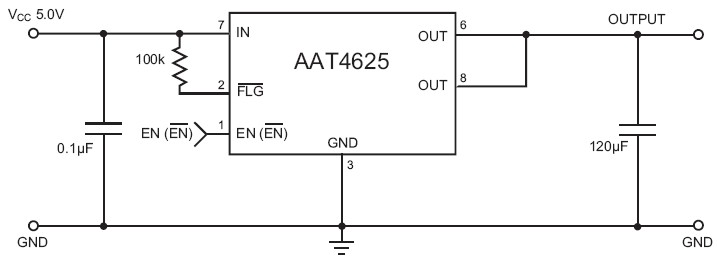 The AAT4625 SmartSwitch is a member of Skyworks' Application Specific Power MOSFET™ (ASPM™) product family. It is a current limited P-channel MOSFET power switch designed for high-side load switching applications operating with inputs ranging from 2.4V to 5.5V, making it ideal for 2.5V, 3V, and 5V systems. An integrated current-limiting circuit protects the input supply from large currents which may cause the supply to fall out of regulation. In addition, the AAT4625 thermal overload protection limits power dissipation and junction temperatures associated with prolonged periods of operation in current limit. Due to its low RDS(ON), the AAT4625 can be used to control loads that require up to factory preset 400mA, 500mA, or 1A. The ultra-fast current limit response to a sudden short circuit is a mere 400ns which reduces the requirements of local supply bypassing. An open drain FAULT flag signals an over-current or overtemperature condition after a 4ms timeout. Quiescent current is a low 10μA and the supply current decreases to less than 1μA in shutdown mode. The AAT4625 is available in a Pb-free 5-pin SOT-23 or a 8-pin SC70JW package and is specified over the -40°C to +85°C temperature range. The AAT4600 series is a family of adjustable and fixed voltage SmartSwitch products with a range of current handling capabilities. Single versions with adjustable current limit (AAT4610, AAT4601) or fixed current limit (AAT4625) are available, as well as dual versions with fixed current limit (AAT4626, AAT4670).