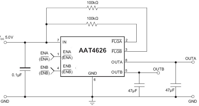 The AAT4626 SmartSwitch is part of Skyworks' Application Specific Power MOSFET (ASPM™) product family. It is a dual-channel 500mA current-limited P-channel MOSFET power switch designed for high-side load switching applications. This switch operates with inputs ranging from 2.7V to 5.5V, making it ideal for both 3V and 5V systems. An integrated current-limiting circuit protects the input supply against large changes in load current which may cause the supply to fall out of regula- tion. The AAT4626 is also protected from thermal over- load which limits power dissipation and junction tem- peratures. The current limit threshold is factory pro- grammed at 1.0A, with a maximum of 1.5A. The quies- cent supply current is typically a low 20μA. In shutdown mode, the supply current decreases to less than 1μA. The AAT4626 is available in a Pb-free, 8-pin SOP pack- age and is specified over the -40°C to +85°C tempera- ture range. The AAT4600 series is a family of adjustable and fixed SmartSwitch products with a range of current handling capabilities. Single versions are available with adjustable current limit (AAT4601) or fixed current limit (AAT4626), as well as dual versions with fixed current limit (AAT4626).