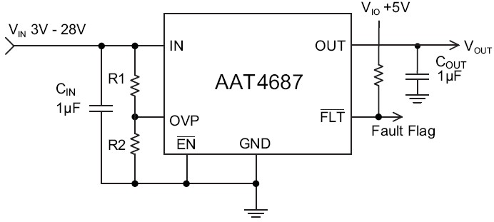 The AAT4687 OVPSwitch™ is a member of Skyworks' Application Specific Power MOSFET™ (ASPM™) product family. It is a P-channel MOSFET power switch with precise over-voltage protection control, designed to protect low-voltage systems against high-voltage faults up to +28V. If the input voltage exceeds the programmed over-voltage threshold, the P-channel MOSFET switch will be turned off to prevent the output load circuits from damage. The AAT4687 is available with an internally programmed over-voltage trip point or as an adjustable version programmed by two external resistors. The AAT4687 includes an under-voltage lockout (UVLO) protection circuit, which will put the device into sleep mode at low input voltages only consuming < 1μA of current. The AAT4687 also includes an enable pin (EN) to enable or disable the device and an OVP, OTP fault indicator (FLT). The AAT4687 is offered in a small Pb-free, 10 pin SC70JW package, and is specified for operation over the -40°C to +85°C ambient temperature range.