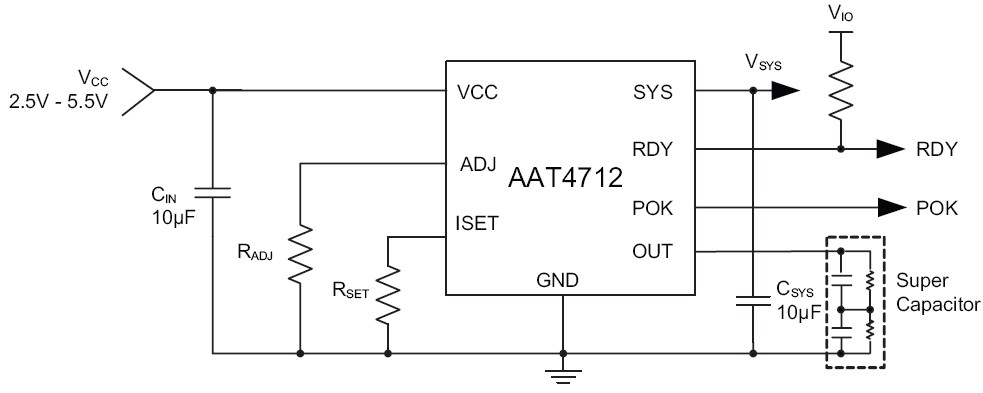 The AAT4712 is a programmed, current limited P-channel MOSFET power switch designed for high-side load-switching applications for SSD memory buffer saving solutions. With the programmed current limit, the AAT4712 ensures that the power ratings of the host are not exceeded and balances the system load and supercap charging current automatically to provide enough system load current in top-priority. The integrated discharge path control assures that the system load can still be supported in the short term when the input power has not fully charged the supercap. The current limit is programmed by an external resistor allowing ±10% accuracy at room temperature. The AAT4712 integrates discharge path for SYS (to system load) from VCC input or OUT input (connect to supercap). The low RDS(ON) from OUT to SYS prolongs the supercap backup time when VCC drops below a threshold voltage which is programmed by an external resistor from ADJ to ground. The AAT4712 incorporates a POK function which can indicate system input power good. An ADJ pin is provided with the addition of an external resistor for setting the input power good detect threshold. The AAT4712 also incorporates a supercap charge ready (RDY) indicate function. The quiescent supply current is typically a low 70μA from the discharge path of VCC to SYS. The AAT4712 is available in a 16-pin TDFN34 package and is specified over a -40 to 85°C temperature range.