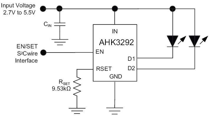 The AHK3292 is a linear current-sink LED driver, capable of driving one or two LEDs up to 30.2mA each. Featuring individual low resistance, low drop-out voltage current sinks, the AHK3292 allows the LEDs to be regulated directly from a Lithium Ion/Polymer battery without the need for an additional step-up power supply, thereby reducing the external component count, eliminating switching noise and maximizing efficiency. Skyworks' Simple Serial Control™ (S2Cwire™) interface is used to enable, disable, and set the LED drive current for 32-level linear scale LED brightness control. For maximum flexibility the LED current can be set, up to a maximum of 30.2mA per channel, using an external RSET resistor. The AHK3292 is packaged in a Pb-free 6-pin SOT23 package and is available over a -40 to +85OC temperature range.
