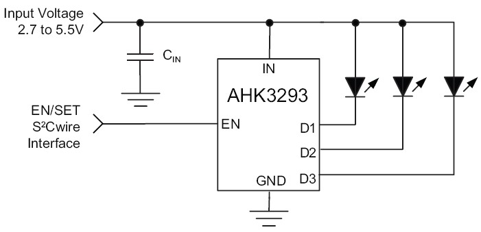 The AHK3293 is a linear current-sink LED driver, capable of driving one, two or three LEDs up to 30.2mA each. Featuring individual low resistance, low drop-out voltage current sinks, the AHK3293 allows the LEDs to be regulated directly from a Lithium Ion/Polymer battery without the need for an additional step-up power supply, thereby reducing the external component count, eliminating switching noise and maximizing efficiency. Skyworks' Simple Serial Control™ (S2Cwire™) interface is used to enable, disable, and set the LED drive current for 32-level linear scale LED brightness control. To minimize the use of external components the LED current is set internally to a maximum of 30.2mA. The AHK3293 is packaged in a Pb-free 6-pin SOT23 package and operates over the -40 to +85OC temperature range.