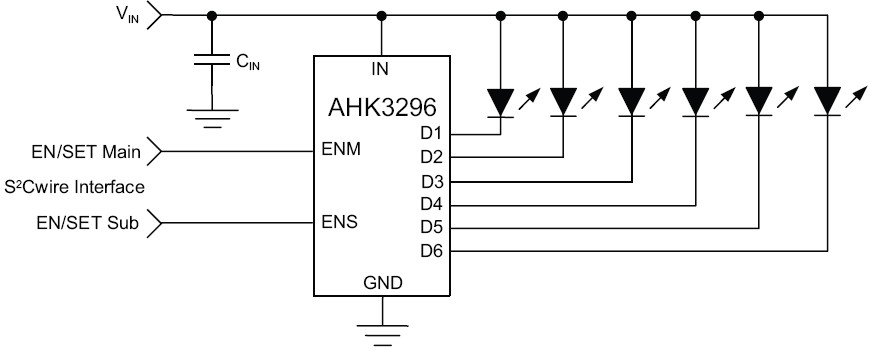 The AHK3296 is a linear current-sink LED driver, capable of driving up to six LEDs at 20.6mA each. Featuring individual low resistance, low drop-out voltage current sinks, the AHK3296 allows the LEDs to be regulated directly from a Lithium Ion/Polymer battery without the need for an additional step-up power supply, thereby reducing the external component count, eliminating switching noise and maximizing efficiency. Skyworks Simple Serial Control™ (S2Cwire™) interface is used to enable, disable, and set the LED drive current for 32-level linear scale LED brightness control. To minimize the use of external components the LED current is set internally to a maximum of 20.6mA. The AHK3296 is packaged in a Pb-free, 10-pin SC70JW or 10-pin TDFN2x2.2 package and operates over the -40°C to +85°C temperature range.
